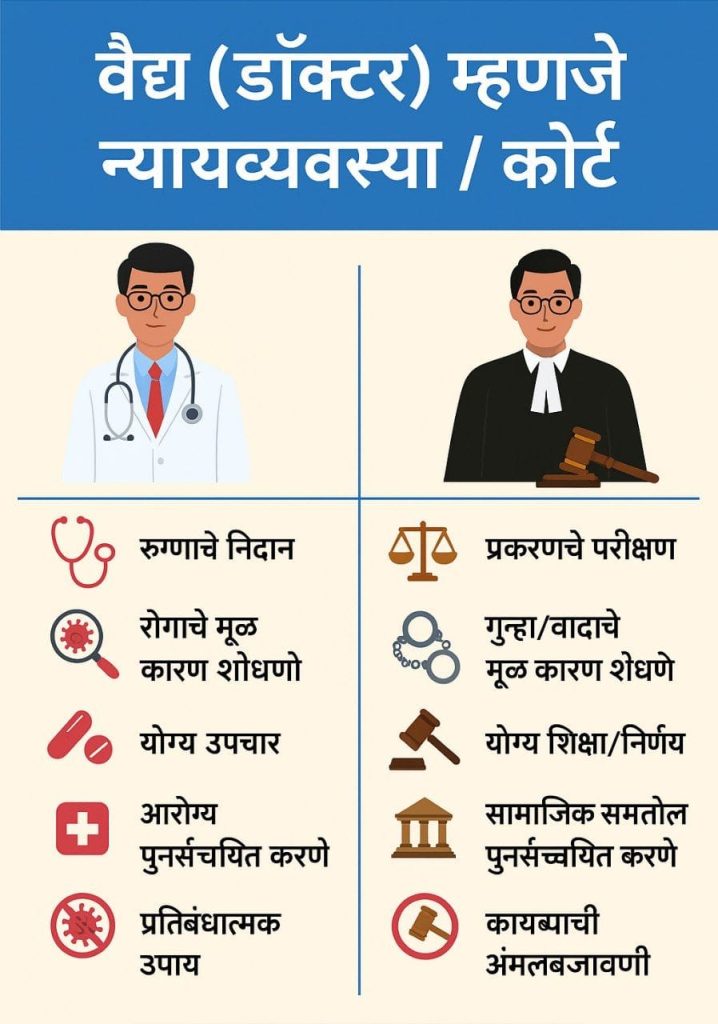 वैद्य (डॉक्टर) म्हणजे न्यायव्यवस्था ( पोलिस यंत्रणा ) व मे .कोर्ट – एक साम्य व अभ्यास पाहता – भारतीय संस्कृतीत “आरोग्य” आणि “सुव्यवस्था” हे दोन आधारस्तंभ मानले जातात. शरीरासाठी वैद्य जसा अत्यावश्यक असतो, तसाच समाजासाठी न्यायव्यवस्था ( मे .कोर्ट / पोलिस यंत्रणा) आवश्यक आहे. या दोन्ही यंत्रणांचा उद्देश एकच — समतोल राखणे व दोषांचे निवारण करणे.